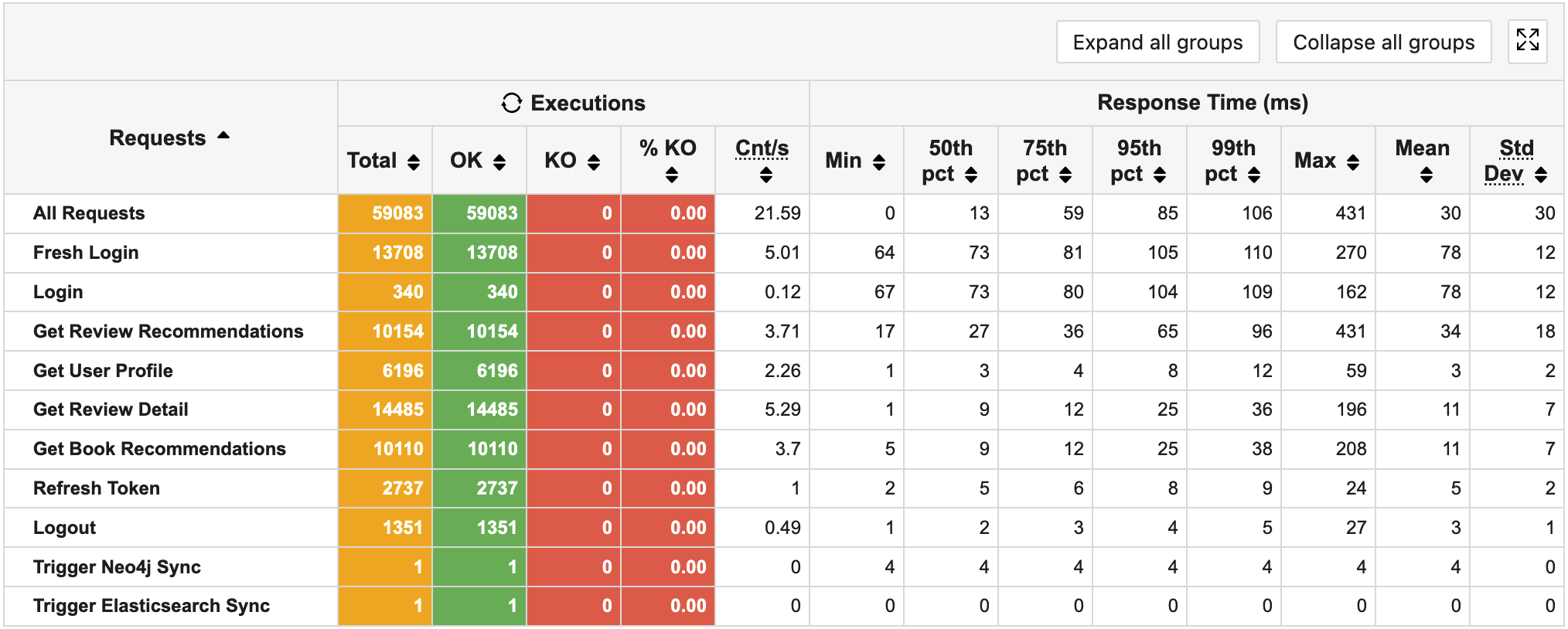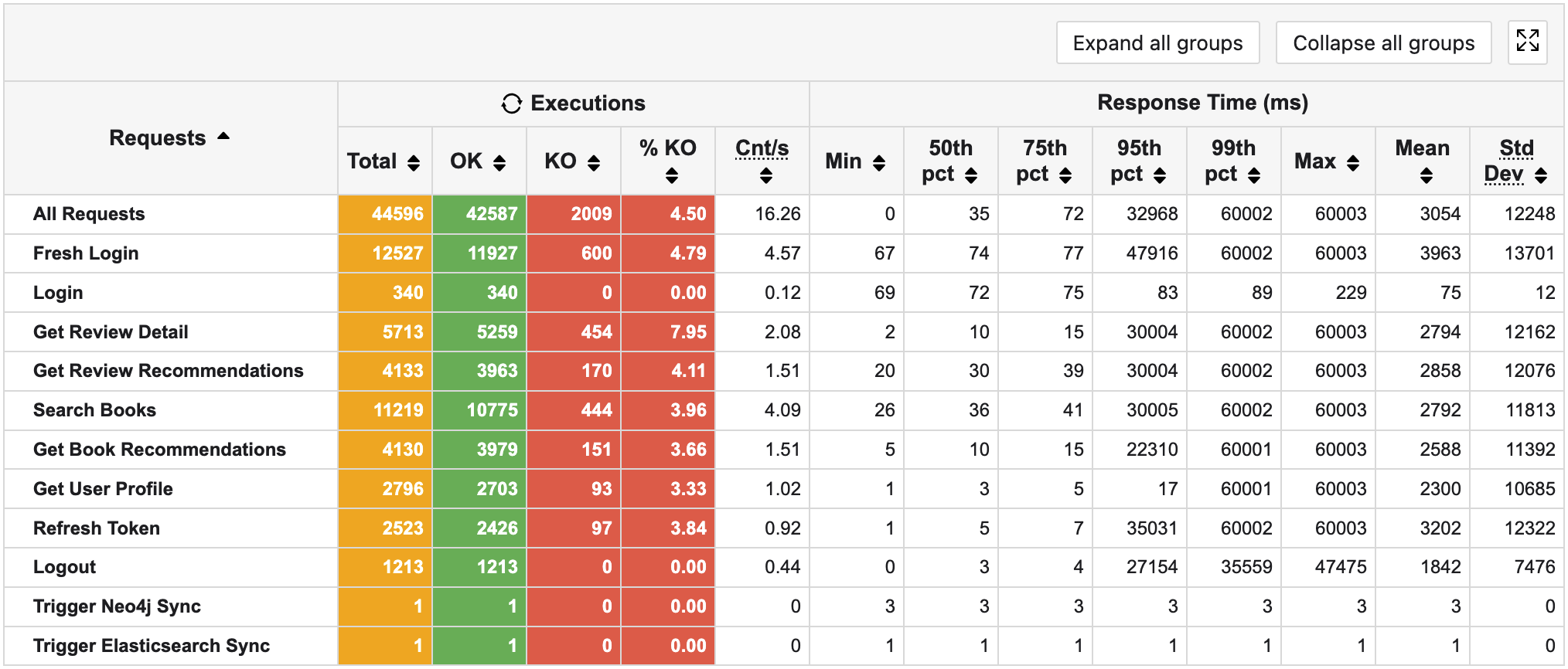 실제 수치 및 프로파일링 정보가 필요하다면 https://github.com/yyubin/bookvoyage/tree/main/performance-test/reports/profiling↗ 로 이동하세요. 실제 stats.json과 마지막 테스트에 대한 jfr, async-profiler의 플레임 그래프를 첨부했습니다. 해당 글에서는 첨부하기 어려운(용량이슈) gatling 리포트를 주요 산출물로 작성하였습니다.