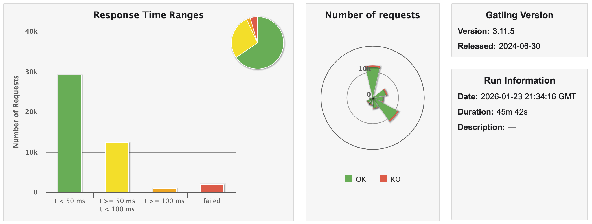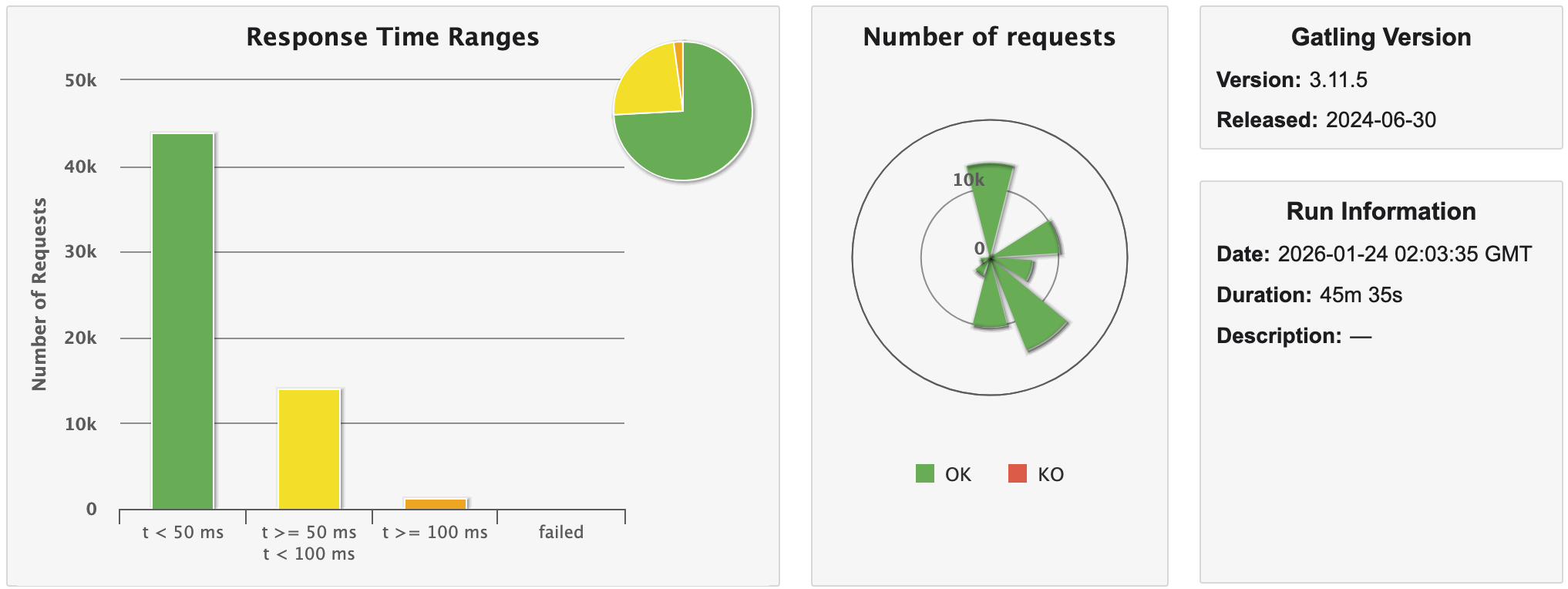 Normal User (80%): Phase 1: rampUsers(40) / 2분 → constantUsersPerSec(0) / 8분 Phase 2: constantUsersPerSec(0) / 15분 Phase 3: rampUsers(40) / 1분 → constantUsersPerSec(1) / 4분 Phase 4: nothingFor(5분) Heavy User (20%): Phase 1: rampUsers(10) / 2분 → constantUsersPerSec(0) / 8분 Phase 2: constantUsersPerSec(0) / 15분 Phase 3: rampUsers(10) / 1분 → constantUsersPerSec(0) / 4분 Phase 4: nothingFor(5분) Login Load: rampUsers(1) / 2분 → constantUsersPerSec(0.5) / 33분 Batch Trigger: nothingFor(10분) → atOnceUsers(1)