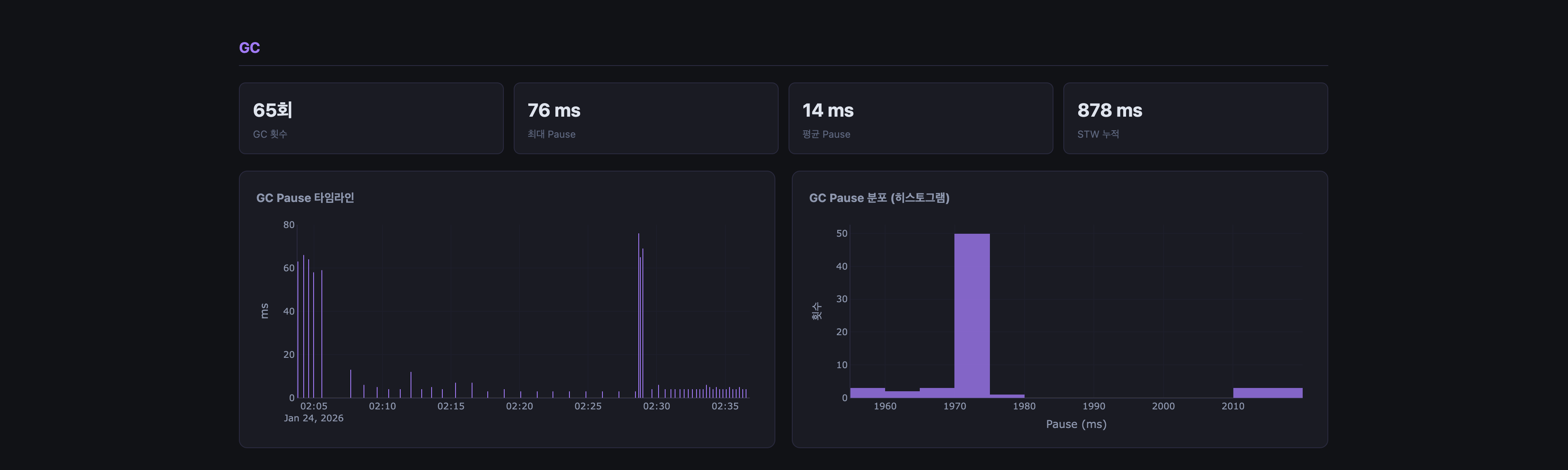 | GC pause | 버킷 내 pause 합산 (ms) |