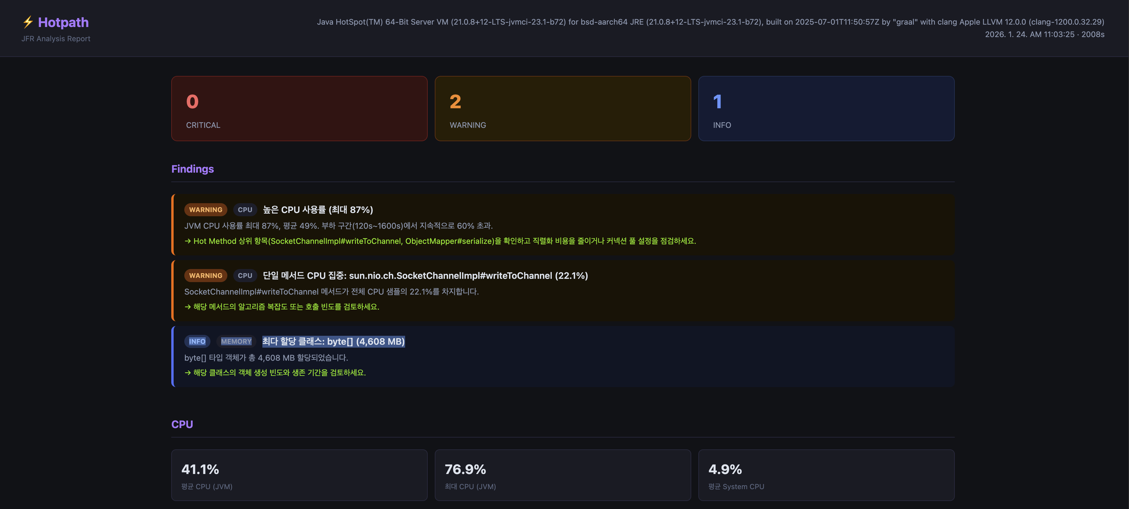 Hotpath는 JVM이 기록한 .jfr 파일을 읽어 CPU, GC, 메모리 할당, 스레드 경합 상태를 분석하고, 브라우저에서 바로 열 수 있는 단일 HTML 파일로 출력하는 CLI 도구다.