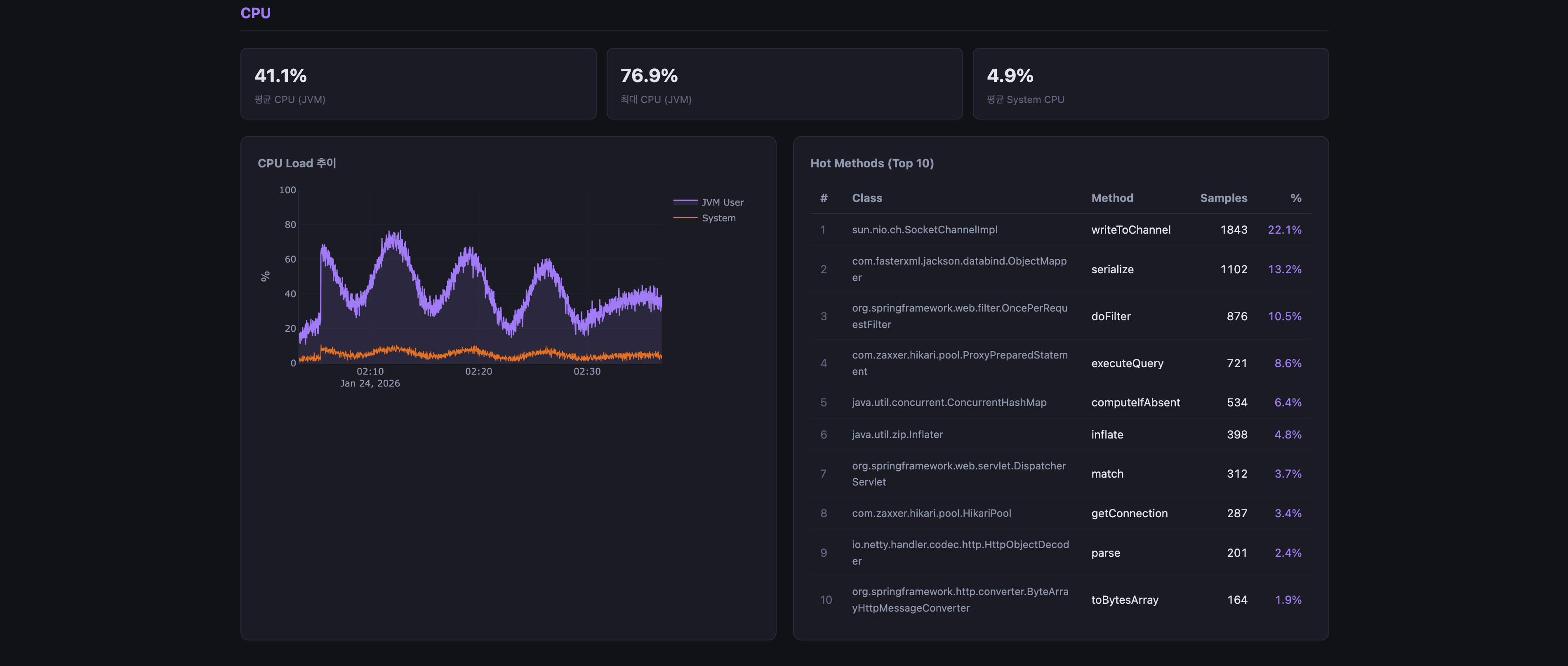 Hot Methods는 executionSamples 맵을 카운트 내림차순 정렬 후 상위 10개를 뽑는다. 각 메서드의 점유율은 (해당 메서드 샘플 수 / 전체 샘플 수) × 100으로 계산한다.