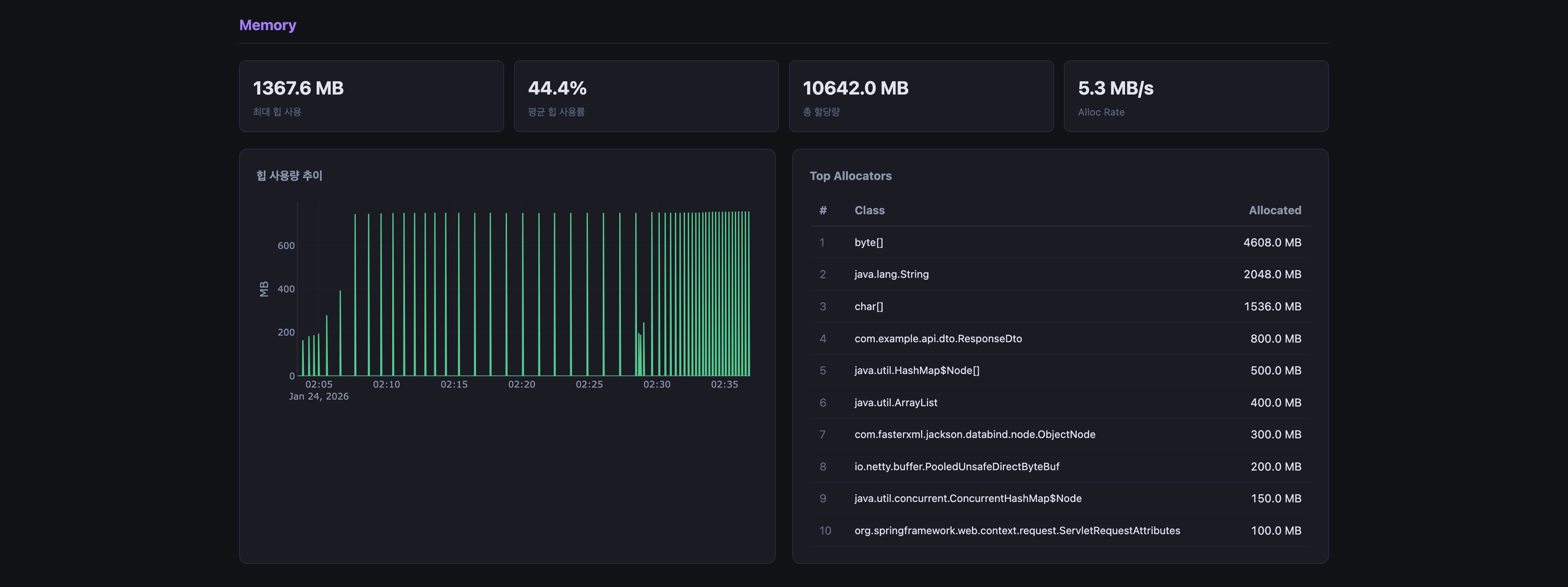 Top Allocators는 클래스별 누적 할당량을 Map<String, Long>으로 집계한 뒤 내림차순 상위 10개를 추출한다.