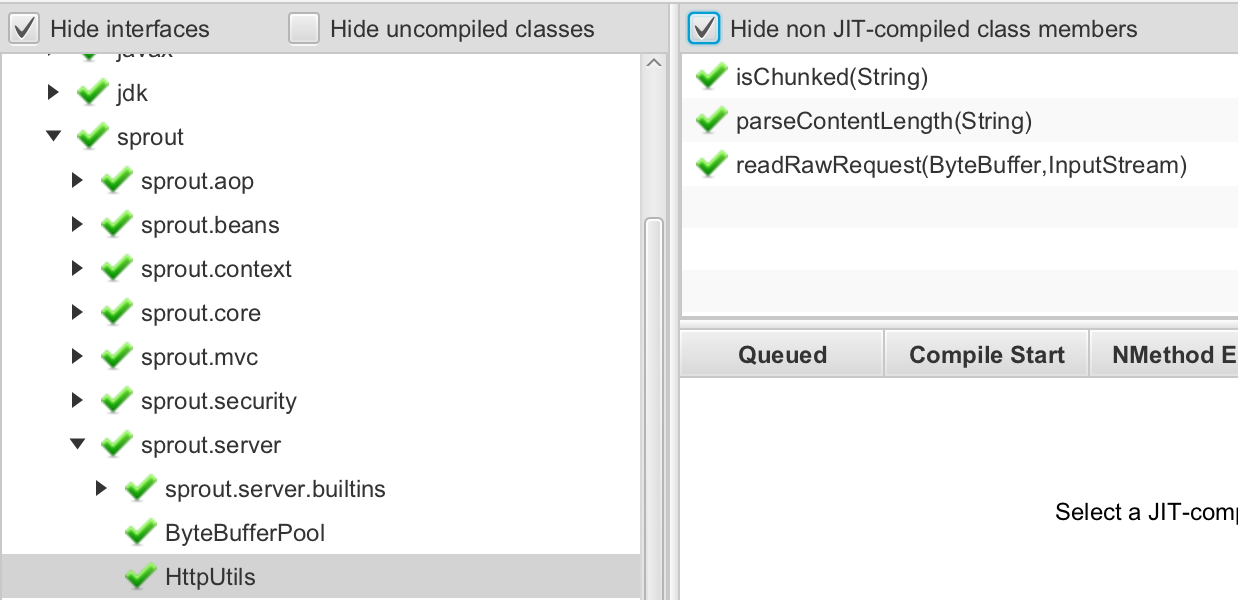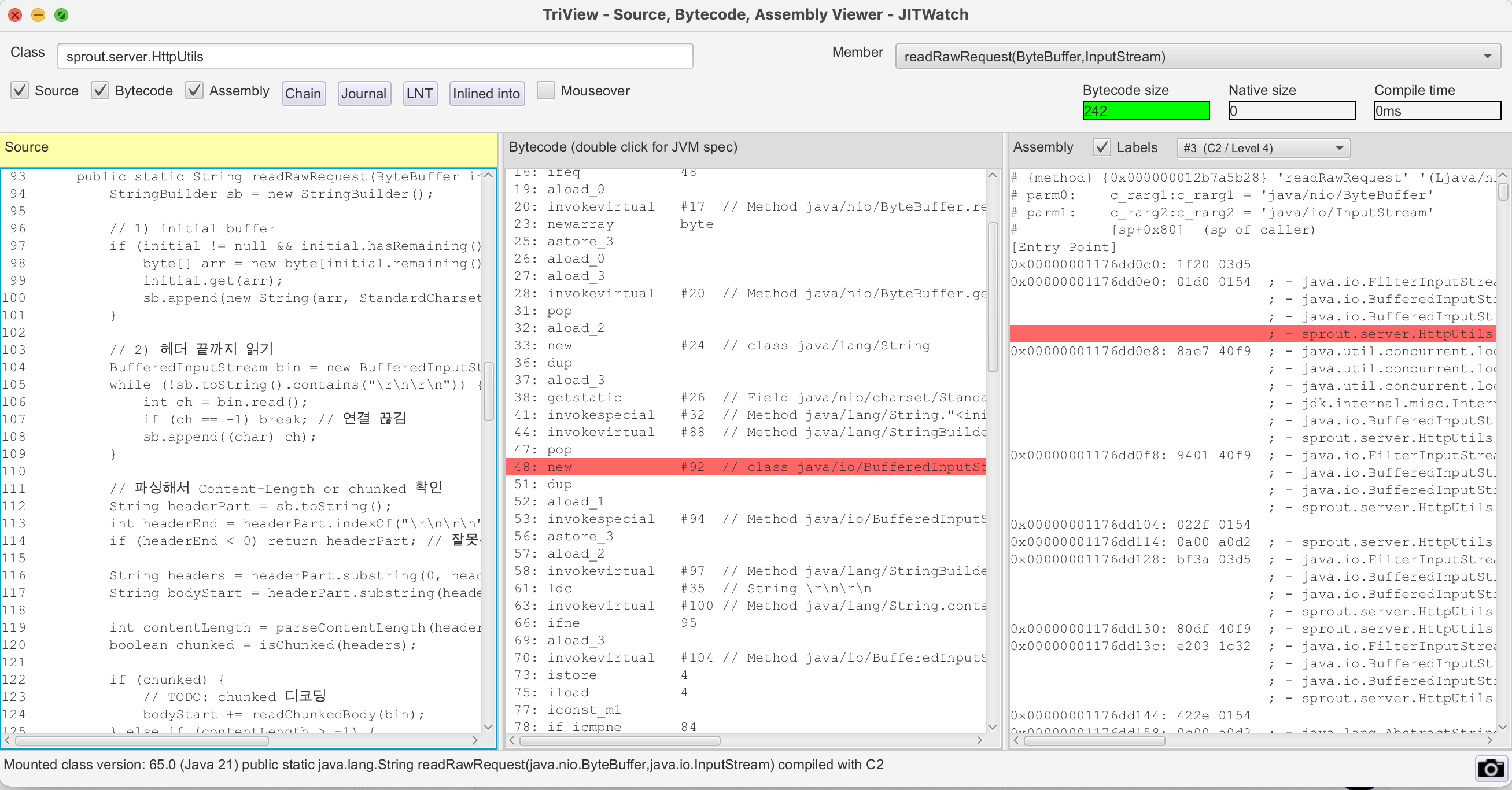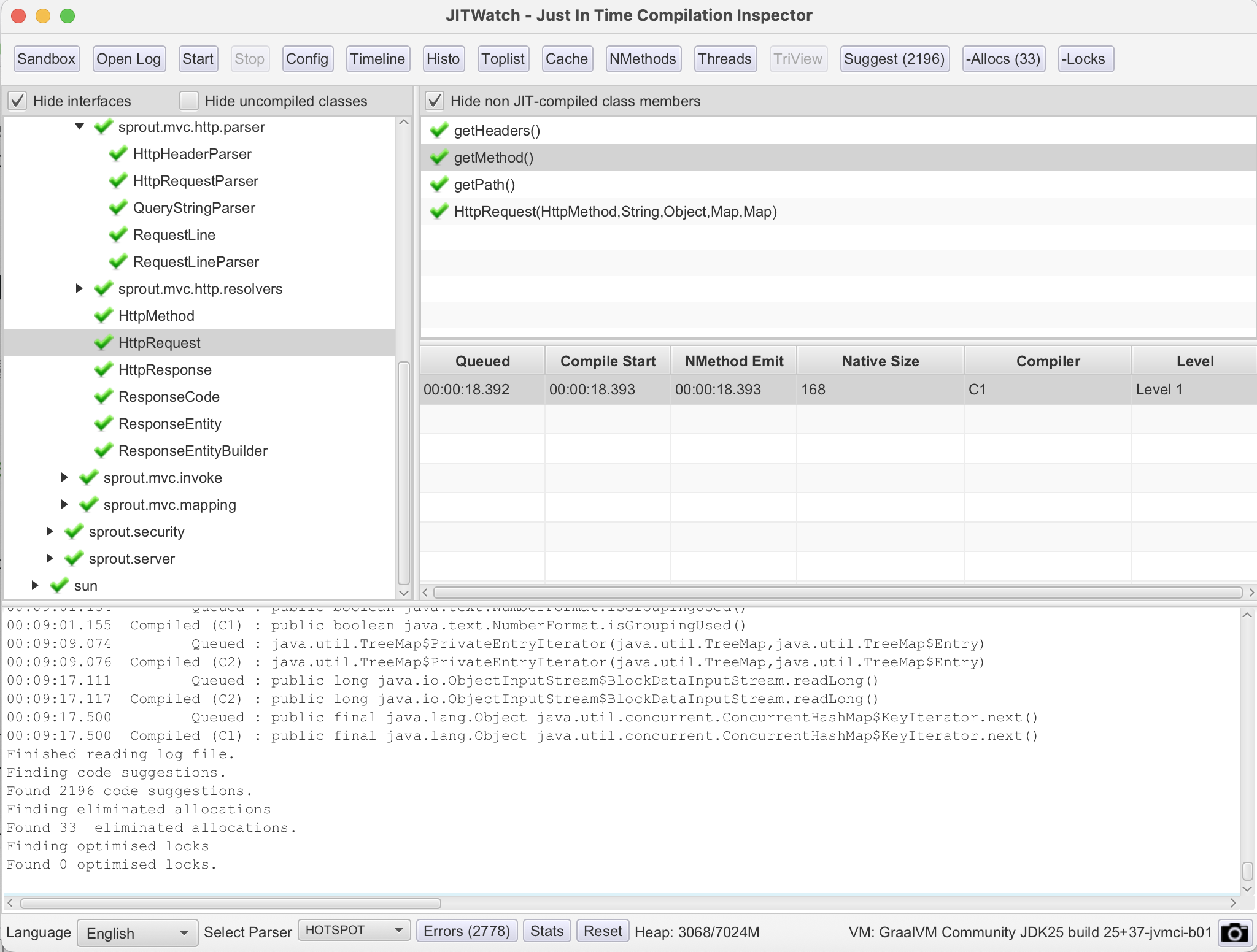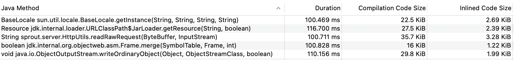실제로 JIT 컴파일이 이루어졌다고 보여짐 ㅋㅋㅋ JMC에서 확인했던 readRawRequest도 포함됨을 알 수 있다. 그리고 다른 메서드들도 컴파일이 되었음을 확인할 수 있다.