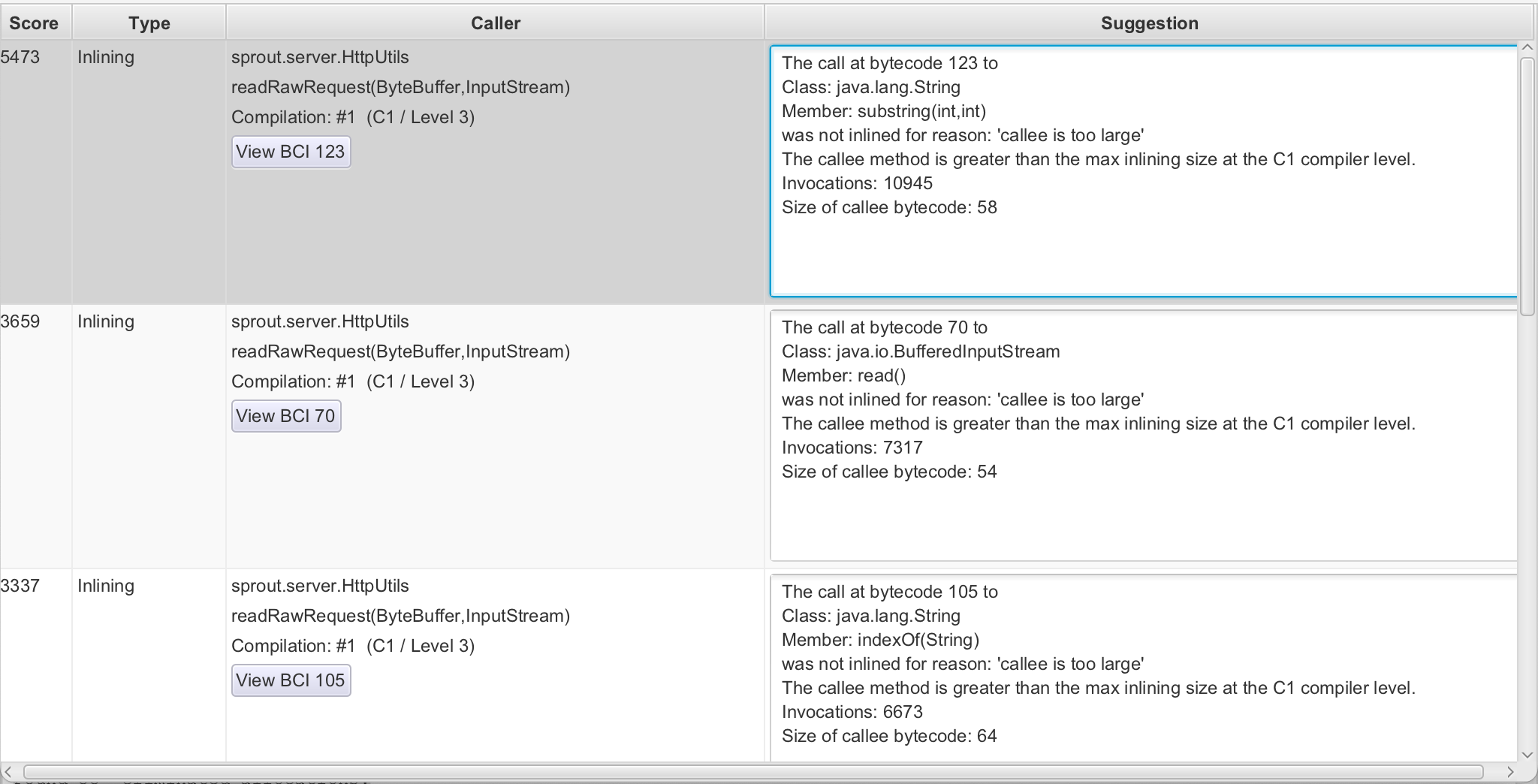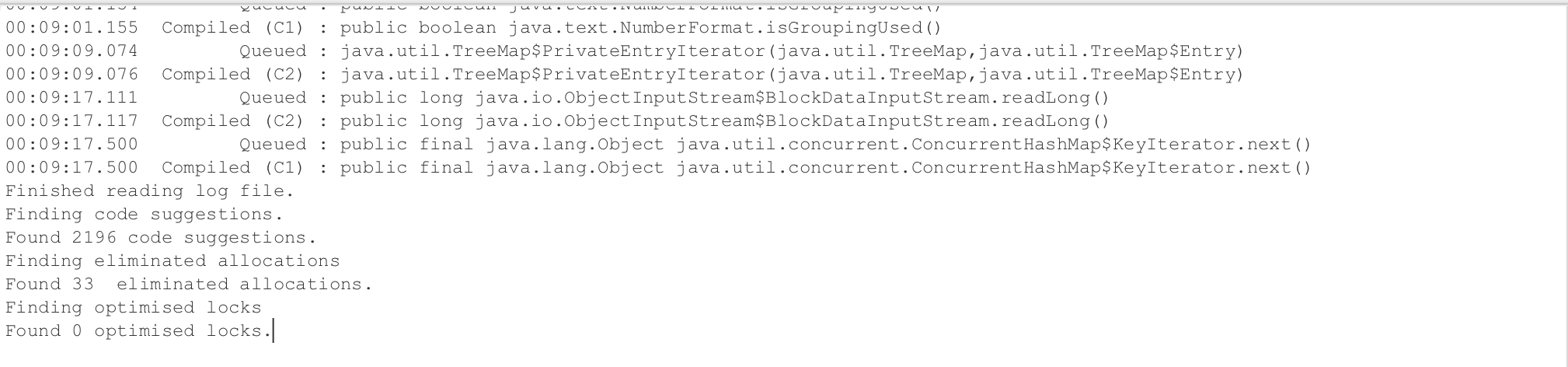 Finished reading log file. Finding code suggestions. Found 2196 code suggestions. Finding eliminated allocations Found 33 eliminated allocations. Finding optimised locks Found 0 optimised locks.