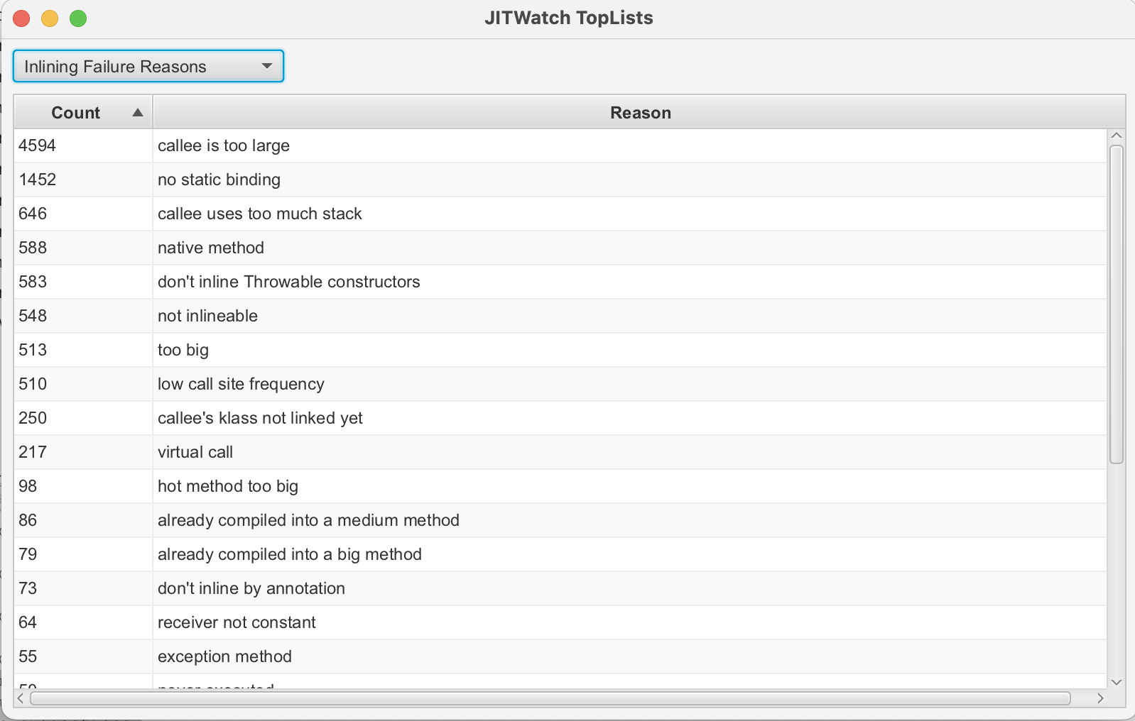 - 인라이닝 실패 이유: 메서드 크기 초과, 스택 초과, 예측 불가능한 분기