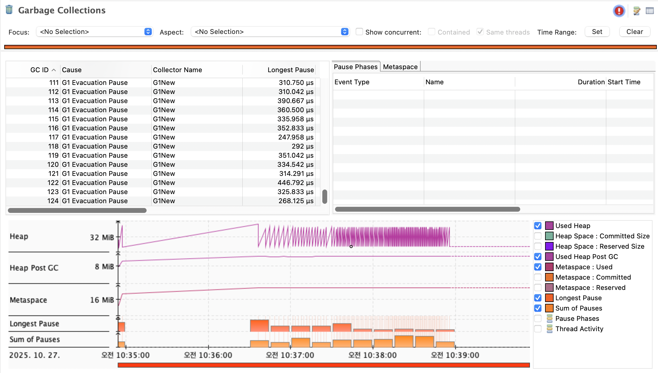- 평균 정지: 0.654 ms, 최대 정지: 2.040 ms, 총 정지: 56.813 ms