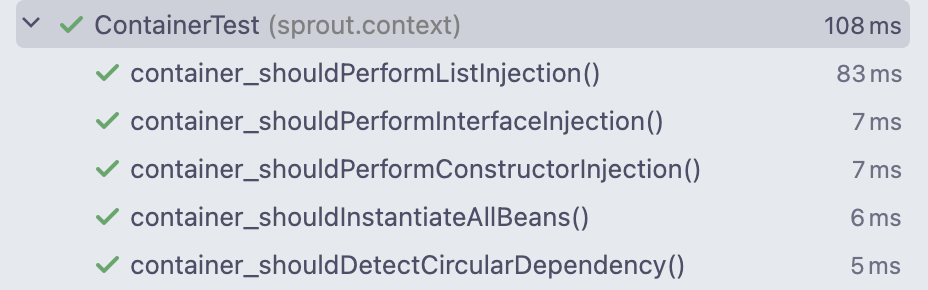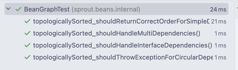 여기까지에서 사실상 하는 것은 빈 생성 "순서"만을 결정하는 게 전부이다. 특별히 고려한 것은, 만약 인터페이스나 추상 클래스로 의존성을 받길 원하는 경우와 순환 참조 발생 여부를 확인하는 것이었다.