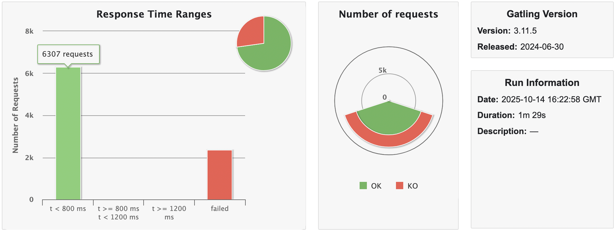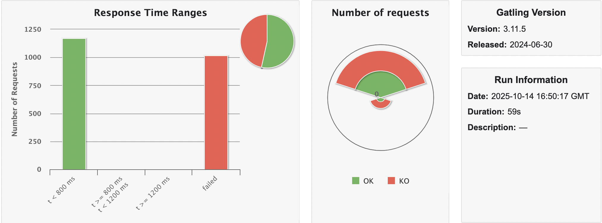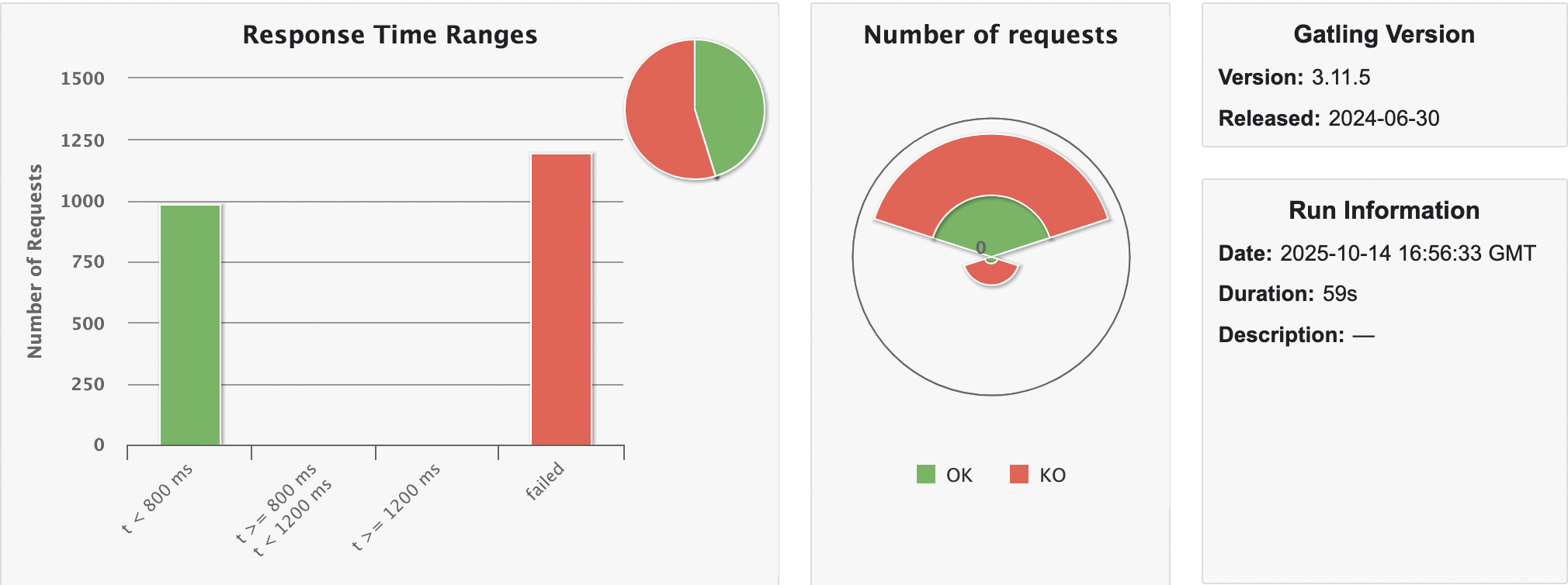 이는 서버가 "cold start" 상태에서 "hot" 상태로 전환되는 과정이다. Java 서버는 런타임에 최적화되는데, 초반에는 리소스 할당/초기화 비용이 크다. Gatling의 warm-up이 10초 정도로 짧은데, 이게 서버의 실제 예열 시간을 따라가지 못하면 KO가 쌓인다. 특히 ramp-up (users 증가) 단계에서 부하가 급증하면 서버가 버티지 못한다.