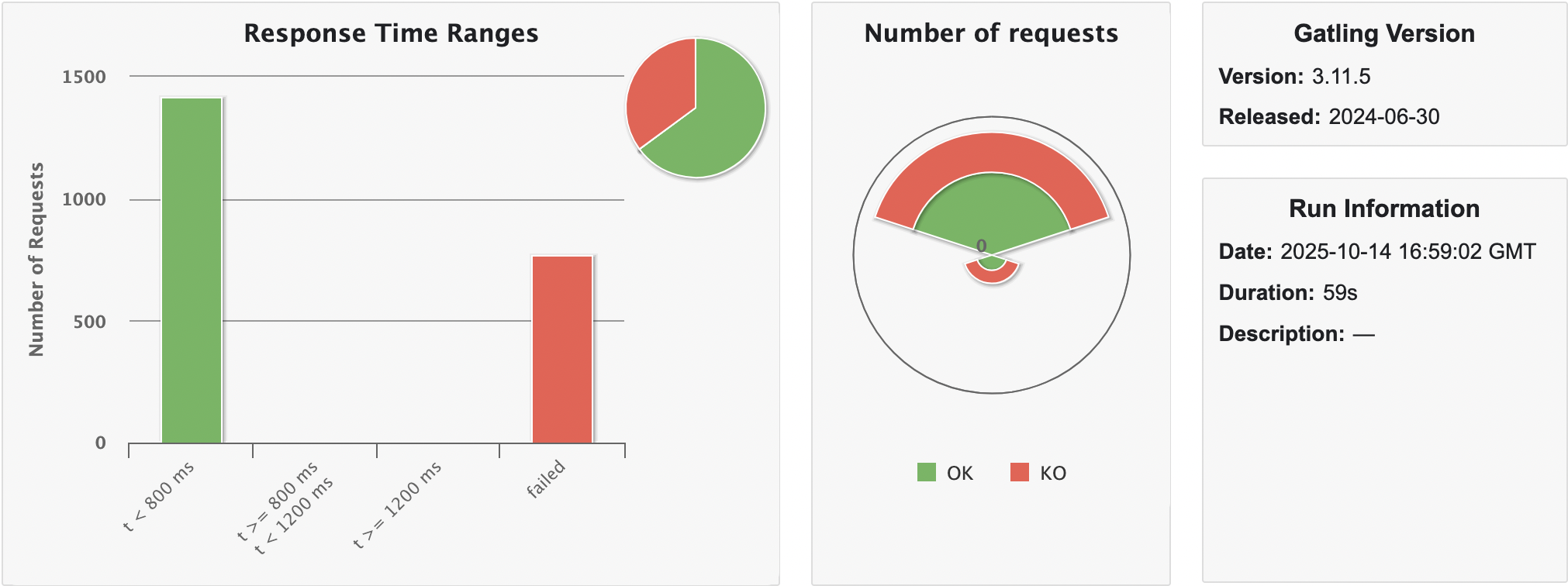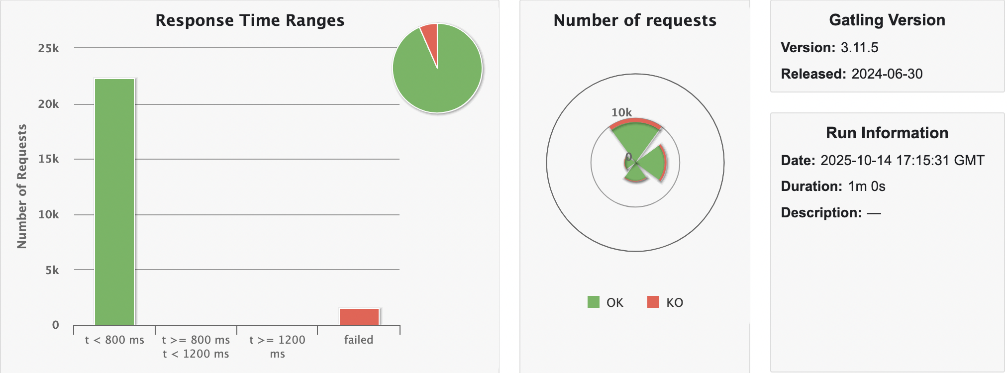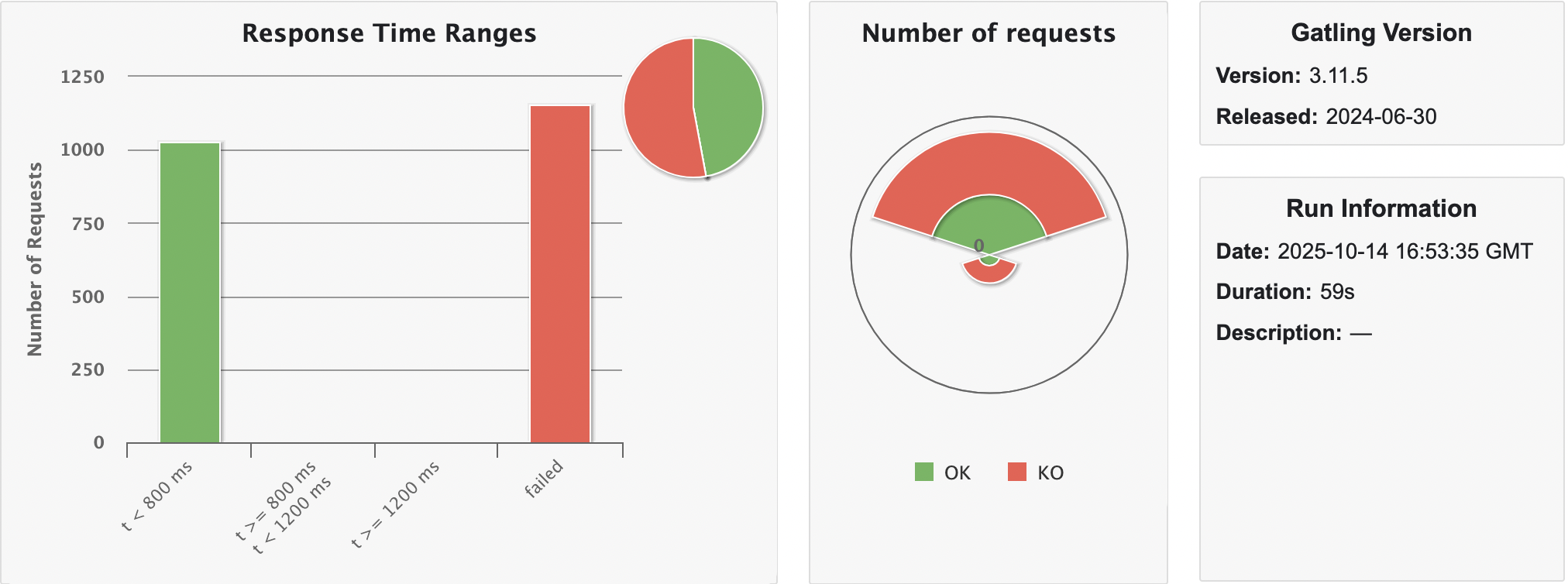 이는 서버가 "cold start" 상태에서 "hot" 상태로 전환되는 과정이다. Java 서버는 런타임에 최적화되는데, 초반에는 리소스 할당/초기화 비용이 크다. Gatling의 warm-up이 10초 정도로 짧은데, 이게 서버의 실제 예열 시간을 따라가지 못하면 KO가 쌓인다. 특히 ramp-up (users 증가) 단계에서 부하가 급증하면 서버가 버티지 못한다.