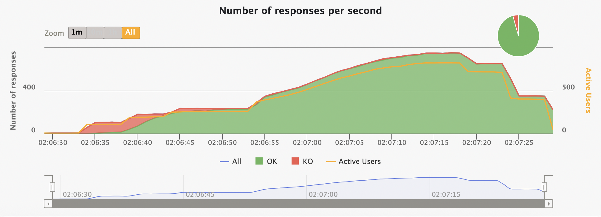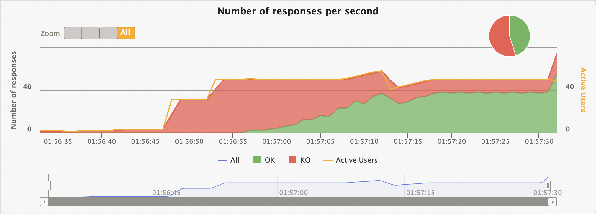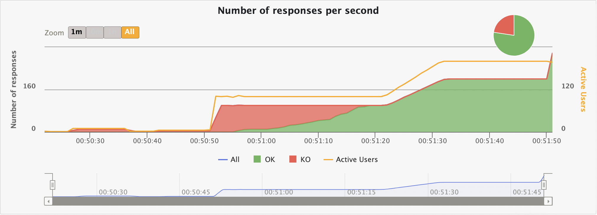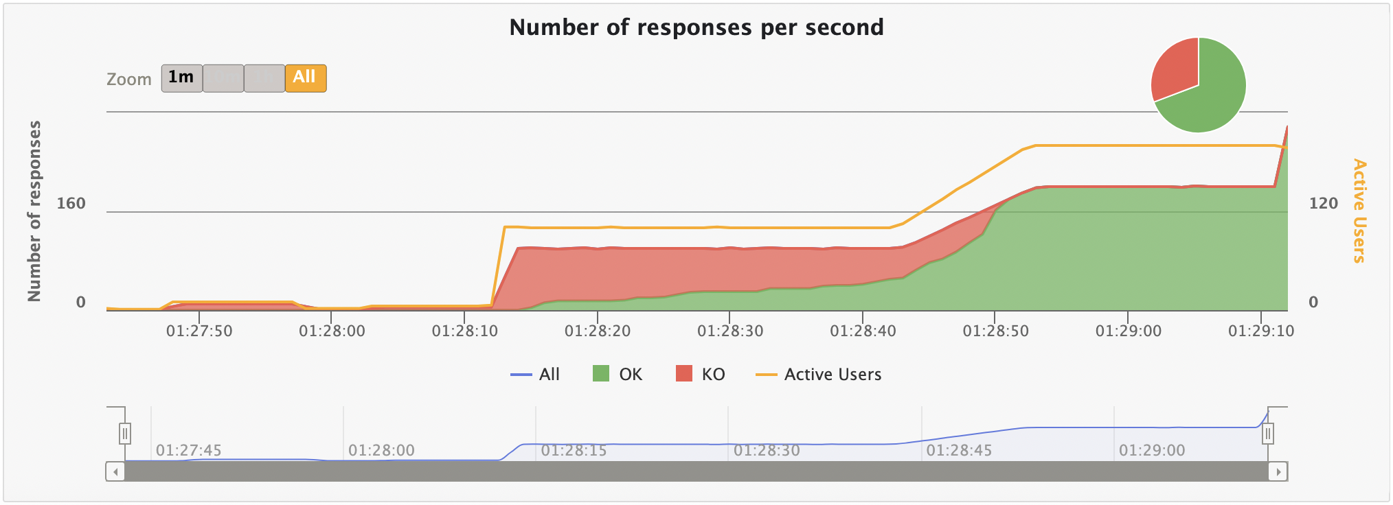 그래프에서 보듯 초반 (01:17:30 ~ 01:18:00)에는 KO (red area)가 두껍고, Active Users (orange line)가 점점 올라가면서 OK (green area)가 증가한다. All responses (blue line)는 낮지만, 이는 서버가 아직 "예열되지" 않아 요청을 제대로 처리하지 못하는 상태를 반영한다. 나중 (01:18:30 이후)에는 안정화되면서 throughput이 올라간다.