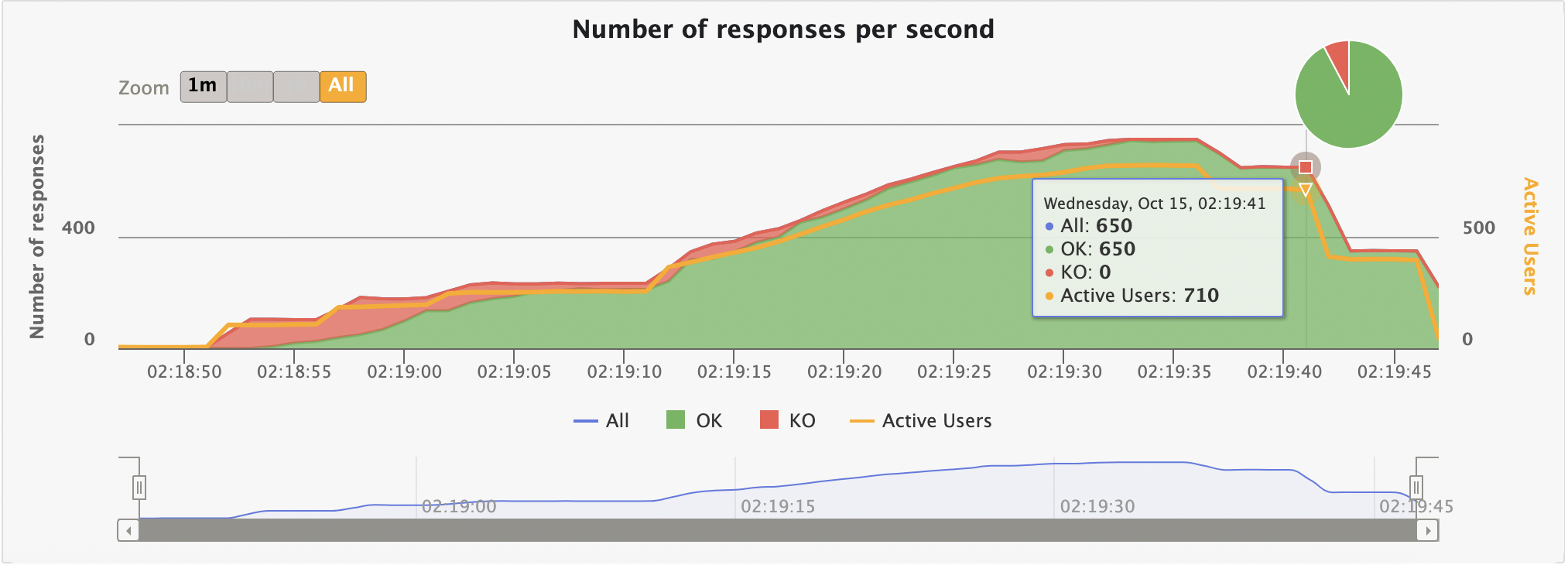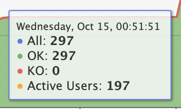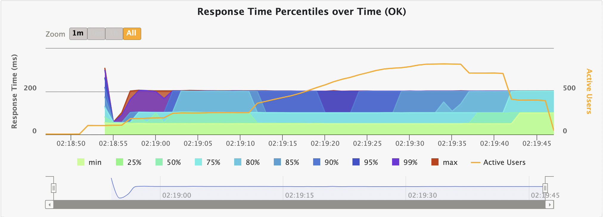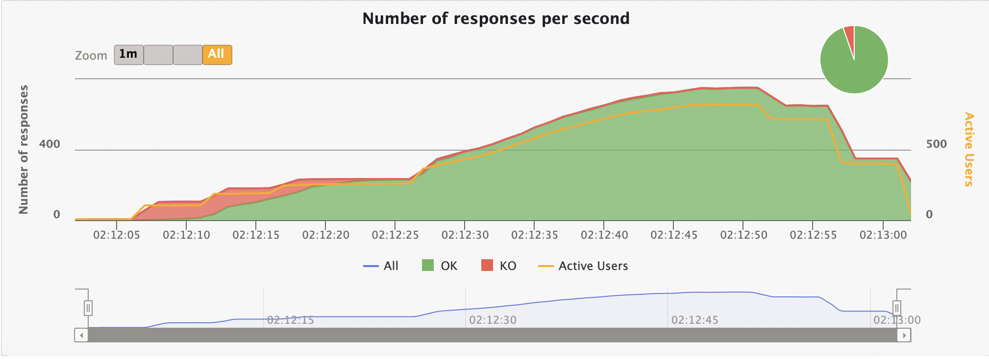 그래프에서 보듯 초반 (01:17:30 ~ 01:18:00)에는 KO (red area)가 두껍고, Active Users (orange line)가 점점 올라가면서 OK (green area)가 증가한다. All responses (blue line)는 낮지만, 이는 서버가 아직 "예열되지" 않아 요청을 제대로 처리하지 못하는 상태를 반영한다. 나중 (01:18:30 이후)에는 안정화되면서 throughput이 올라간다.