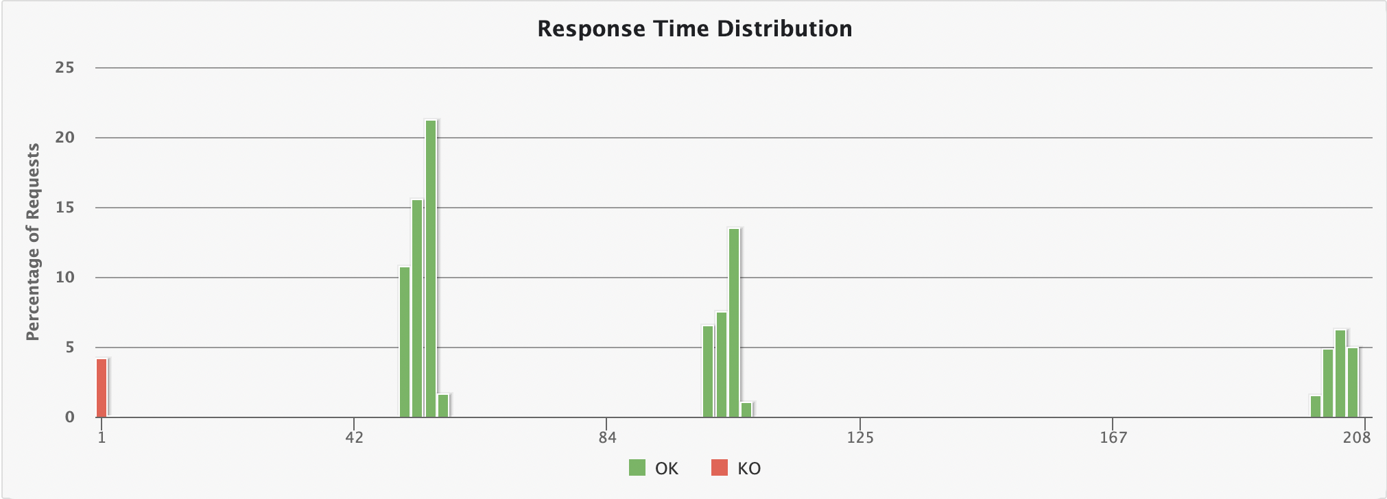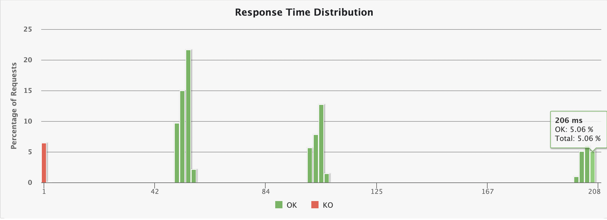 49.33%의 요청이 50ms대에서 처리 되었고, 17.64%의 요청이 200ms대에서 처리되었다. 최장 206ms.