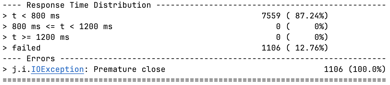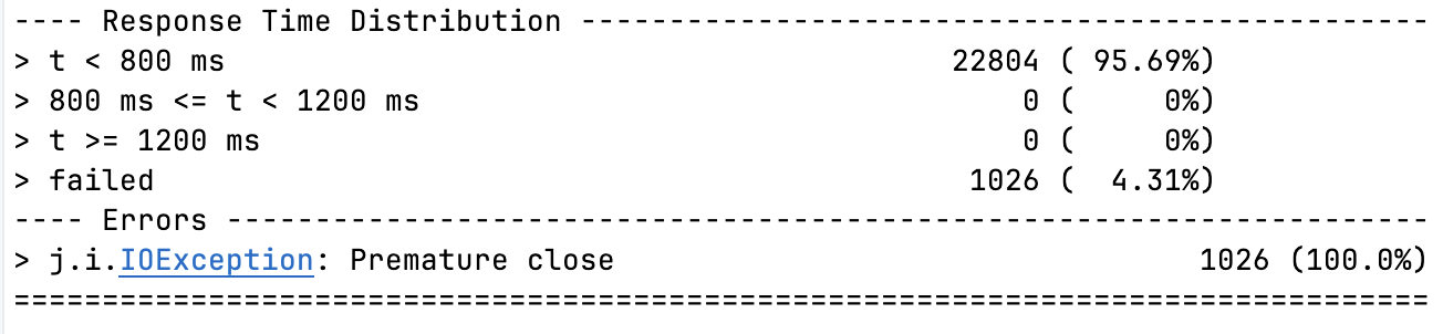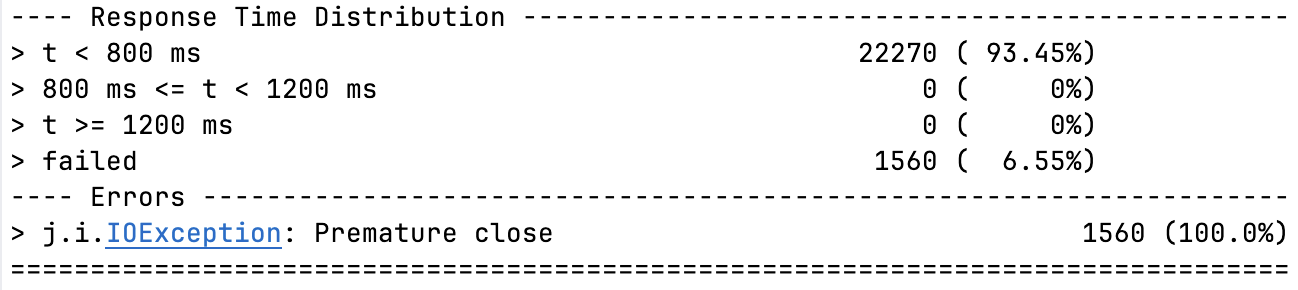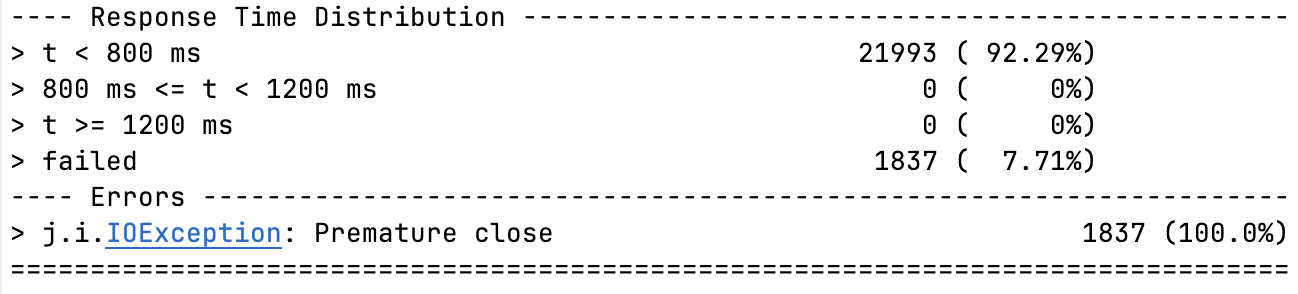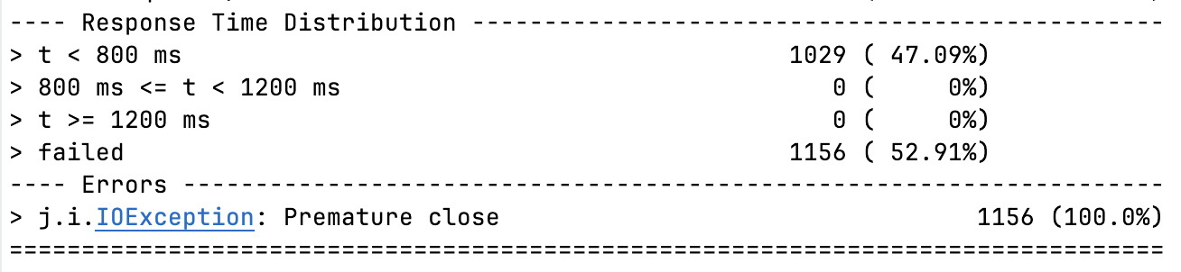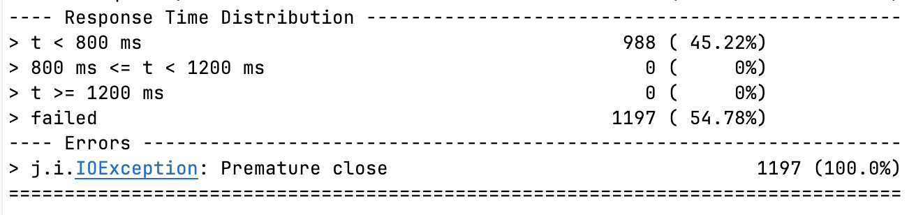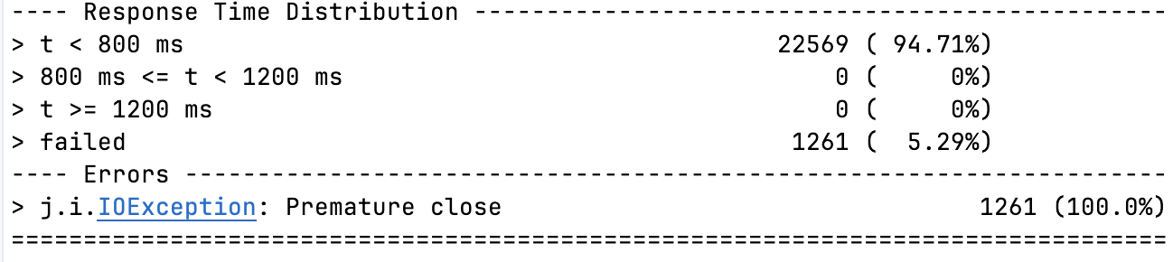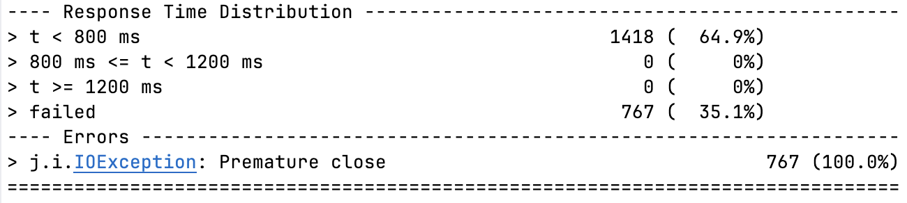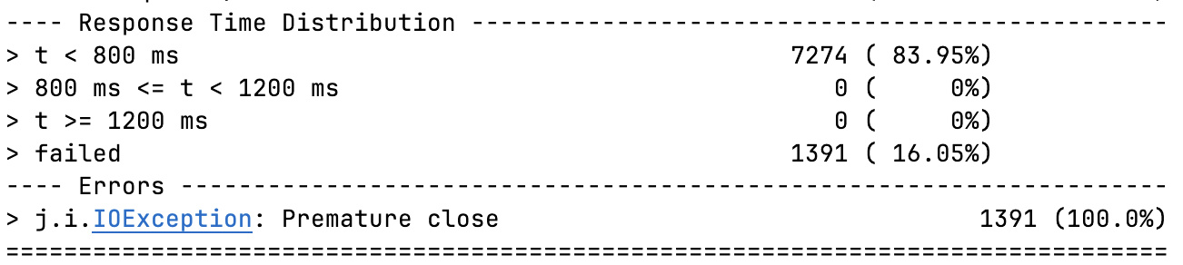 실제로 성공률이 처참함을 알 수 있다. 다만 가정해야 하는 것은, 이번엔 요청 수 자체도 적다는 것이다. 저번 벤치마킹에서 약 8000개의 요청을 보낸 반면 이번엔 2000여개 요청만 보냈음. 그래서 충분한 웜업이 이뤄질 만큼의 진행을 하지 못했을 가능성이 크다.