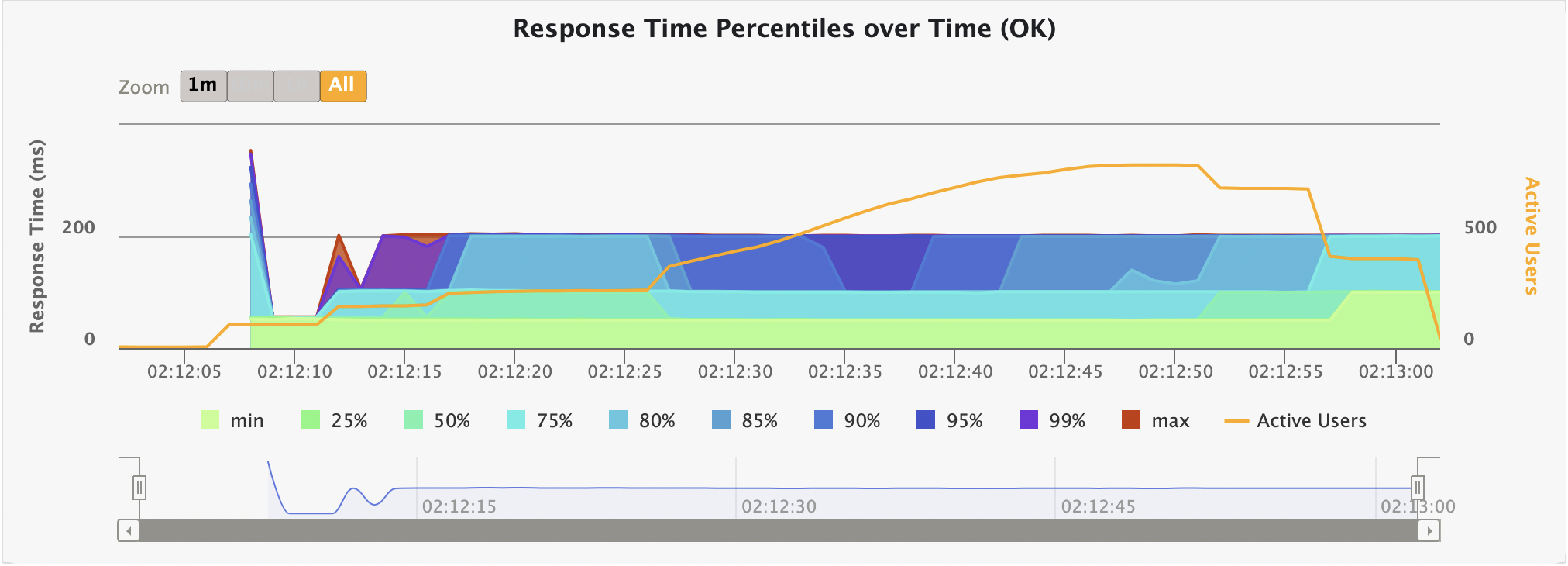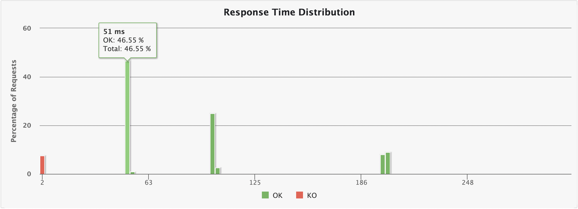 48.52%의 응답이 50ms대에서 처리됨. 이 역시도 의도적으로 딜레이를 준 것. 대충 전체적 기조는 비슷하다.