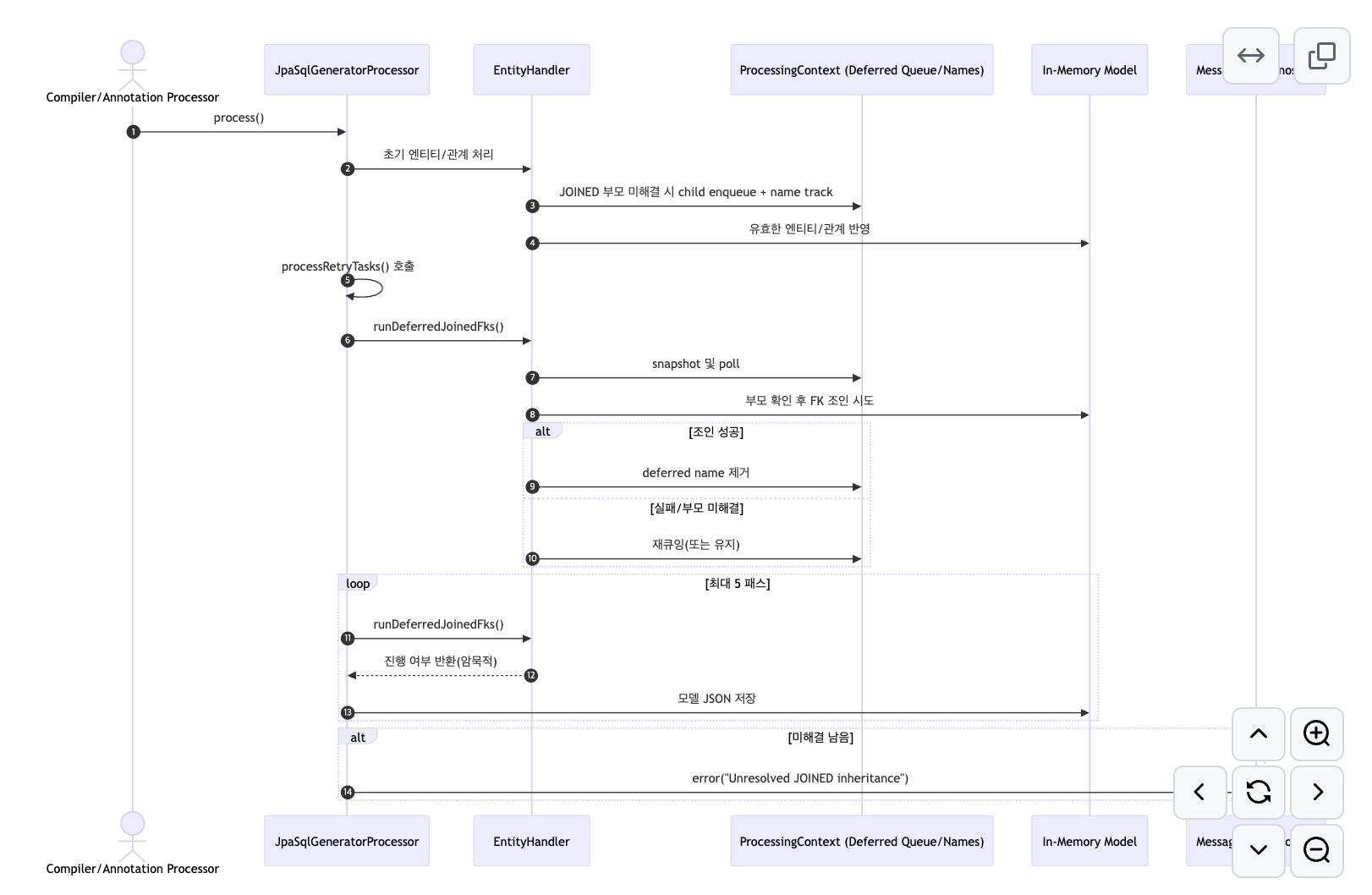 Processor 재시도 루프/테이블 제너레이터 연계jinx-processor/src/main/java/org/jinx/processor/JpaSqlGeneratorProcessor.java | public void processRetryTasks() 추가. 처리 시작 및 관계 해석 후 최대 5회 runDeferredJoinedFks() 재시도 루프 추가. 미해결 시 Diagnostic 에러 보고. 각 라운드 후 모델 JSON 저장. TableGeneratorHandler 초기화 및 주입. |