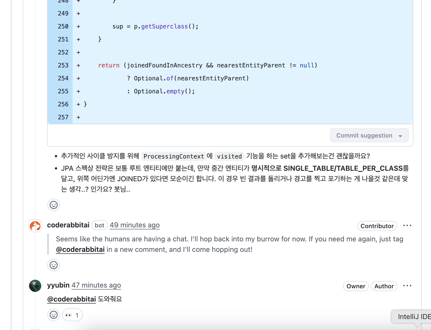 CodeRabbit AI는 핵심 로직에 대해서도 명쾌하게 리뷰해줬다. 내가 작성한 findNearestJoinedParentEntity 메서드에 대한 리팩토링을 다음과 같이 제안했다.