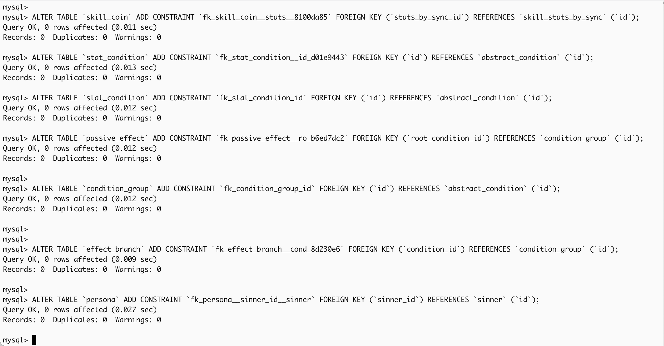 -- Jinx Migration Header -- jinx:baseline=sha256:initial -- jinx:head=sha256:4bd8c9c2ca3a39063efea2968949ef590e6318dbdd2719148c3a4dc9e5fb9517 -- jinx:version=20251024192633 -- jinx:generated=2025-10-24T19:26:48.136685 CREATE TABLE `sinner` ( `id` BIGINT NOT NULL AUTO_INCREMENT, `name` VARCHAR(20) NOT NULL, `nameEn` VARCHAR(40) NOT NULL, PRIMARY KEY (`id`) ) ENGINE=InnoDB DEFAULT CHARSET=utf8mb4 COLLATE=utf8mb4_unicode_ci; CONSTRAINT `uq_sinner__nameen` UNIQUE (`nameEn`), CONSTRAINT `uq_sinner__name` UNIQUE (`name`), CREATE TABLE `skill_effect` ( `stats_by_sync_id` BIGINT, `original_text` TEXT, `id` BIGINT NOT NULL AUTO_INCREMENT, `root_condition_id` BIGINT, `trigger_json` TEXT NOT NULL, PRIMARY KEY (`id`) ) ENGINE=InnoDB DEFAULT CHARSET=utf8mb4 COLLATE=utf8mb4_unicode_ci; CREATE INDEX `ix_skill_effect__root_3c1d0a6d` ON `skill_effect` (`root_condition_id`); CREATE INDEX `ix_skill_effect__stat_ed249766` ON `skill_effect` (`stats_by_sync_id`); CREATE TABLE `skill_stats_by_sync` ( `level` INT NOT NULL, `coinPower` INT NOT NULL, `basePower` INT NOT NULL, `id` BIGINT NOT NULL AUTO_INCREMENT, `weight` INT NOT NULL, `syncLevel` ENUM('SYNC_1','SYNC_2','SYNC_3','SYNC_4') NOT NULL, `coinCount` INT NOT NULL, PRIMARY KEY (`id`) ) ENGINE=InnoDB DEFAULT CHARSET=utf8mb4 COLLATE=utf8mb4_unicode_ci; CREATE TABLE `skill` ( `defenseType` ENUM('COUNTER','EVADE','GUARD'), `skillCategory` ENUM('ATTACK','DEFENSE') NOT NULL, `attackType` ENUM('SLASH','PIERCE','BLUNT'), `keywordType` ENUM('BURN','BLEED','TREMOR','RUPTURE','SINKING','BREATH','CHARGE','NONE') NOT NULL, `name` VARCHAR(100) NOT NULL, `sinAffinity` ENUM('WRATH','LUST','SLOTH','GREED','GLOOM','PRIDE','ENVY','NONE') NOT NULL, `id` BIGINT NOT NULL AUTO_INCREMENT, `skillImage` VARCHAR(500), `skillNumber` INT NOT NULL, `skillQuantity` INT, PRIMARY KEY (`id`) ) ENGINE=InnoDB DEFAULT CHARSET=utf8mb4 COLLATE=utf8mb4_unicode_ci; CREATE TABLE `range_condition` ( `min_inclusive` INT NOT NULL, `scope` ENUM('BATTLE','TURN','SKILL','COIN') NOT NULL, `id` BIGINT NOT NULL AUTO_INCREMENT, `stat_code` VARCHAR(255) NOT NULL, `max_exclusive` INT, `target` ENUM('SELF','ENEMY','ENEMY_ALL','ALLY','ALLY_ALL','SELF_ALLY','ANY','RIGHT_ALLY','LEFT_ALLY','LOWEST_HP_ALLY','HIGHEST_RESONANCE') NOT NULL, PRIMARY KEY (`id`) ) ENGINE=InnoDB DEFAULT CHARSET=utf8mb4 COLLATE=utf8mb4_unicode_ci; CREATE TABLE `abstract_condition` ( `condition_type` VARCHAR(31) NOT NULL, `scope` ENUM('BATTLE','TURN','SKILL','COIN') NOT NULL, `id` BIGINT NOT NULL AUTO_INCREMENT, PRIMARY KEY (`id`) ) ENGINE=InnoDB DEFAULT CHARSET=utf8mb4 COLLATE=utf8mb4_unicode_ci; CREATE TABLE `skill_coin` ( `stats_by_sync_id` BIGINT NOT NULL, `id` BIGINT NOT NULL AUTO_INCREMENT, `orderIndex` INT NOT NULL, `coinType` ENUM('NORMAL','UNBREAKABLE','REUSE') NOT NULL, PRIMARY KEY (`id`) ) ENGINE=InnoDB DEFAULT CHARSET=utf8mb4 COLLATE=utf8mb4_unicode_ci; CREATE INDEX `ix_skill_coin__stats__a06903e6` ON `skill_coin` (`stats_by_sync_id`); CREATE TABLE `stat_condition` ( `scope` ENUM('BATTLE','TURN','SKILL','COIN') NOT NULL, `id` BIGINT NOT NULL AUTO_INCREMENT, `stat_code` VARCHAR(255) NOT NULL, `threshold` INT NOT NULL, `operator` ENUM('EQUAL','NOT_EQUAL','GREATER_THAN','GREATER_THAN_OR_EQUAL','LESS_THAN','LESS_THAN_OR_EQUAL','IN_RANGE','DIVISIBLE_BY','HAS_TAG','HAS_STATUS') NOT NULL, `target` ENUM('SELF','ENEMY','ENEMY_ALL','ALLY','ALLY_ALL','SELF_ALLY','ANY','RIGHT_ALLY','LEFT_ALLY','LOWEST_HP_ALLY','HIGHEST_RESONANCE') NOT NULL, PRIMARY KEY (`id`) ) ENGINE=InnoDB DEFAULT CHARSET=utf8mb4 COLLATE=utf8mb4_unicode_ci; CREATE INDEX `ix_stat_condition__id` ON `stat_condition` (`id`); CREATE TABLE `passive_effect` ( `original_text` TEXT, `id` BIGINT NOT NULL AUTO_INCREMENT, `root_condition_id` BIGINT, `trigger_json` TEXT NOT NULL, PRIMARY KEY (`id`) ) ENGINE=InnoDB DEFAULT CHARSET=utf8mb4 COLLATE=utf8mb4_unicode_ci; CREATE INDEX `ix_passive_effect__ro_ba6233c3` ON `passive_effect` (`root_condition_id`); CREATE TABLE `effect_action` ( `scope` ENUM('SKILL','COINS_SKILL','COIN_EACH','COIN_LAST','COIN_FIRST','COIN_INDEX','THIS_COIN','NEXT_COIN'), `coin_selector_json` TEXT, `policy` ENUM('ADD','MULTIPLY','OVERRIDE','SUPPRESS','REPLACE_OUTCOME','SET'), `cap_max` INT, `priority` INT, `cap_per_target` INT, `action_type` ENUM('STATUS_INFLICT','STATUS_REMOVE','BUFF_DAMAGE_UP','BUFF_DAMAGE_DOWN','BUFF_DEFENSE_UP','BUFF_DEFENSE_DOWN','RESOURCE_GAIN','RESOURCE_CONSUME','RESOURCE_SET','DAMAGE_MODIFY','POWER_MODIFY','HEAL_HP','CONSUME_HP','COIN_POWER_UP','CLASH_POWER_UP','COMMAND_ATTACK','TRANSFORM_SKILL','SUPPRESS_EFFECT','ETC') NOT NULL, `id` BIGINT NOT NULL AUTO_INCREMENT, `duration_turns` INT, `timing` ENUM('IMMEDIATE','THIS_TURN','NEXT_TURN','TURN_END','NEXT_COIN','ATTACK_END'), `stat_code` VARCHAR(255), `target_selector_json` TEXT, `amount_json` TEXT, PRIMARY KEY (`id`) ) ENGINE=InnoDB DEFAULT CHARSET=utf8mb4 COLLATE=utf8mb4_unicode_ci; CREATE TABLE `condition_group` ( `ordered` TINYINT(1) NOT NULL DEFAULT '0', `scope` ENUM('BATTLE','TURN','SKILL','COIN') NOT NULL, `id` BIGINT NOT NULL AUTO_INCREMENT, `operator` ENUM('AND','OR') NOT NULL, PRIMARY KEY (`id`) ) ENGINE=InnoDB DEFAULT CHARSET=utf8mb4 COLLATE=utf8mb4_unicode_ci; CREATE TABLE `coin_effect` ( `id` BIGINT NOT NULL AUTO_INCREMENT, `original_text` TEXT, `trigger_json` TEXT NOT NULL, PRIMARY KEY (`id`) ) ENGINE=InnoDB DEFAULT CHARSET=utf8mb4 COLLATE=utf8mb4_unicode_ci; CREATE TABLE `persona_image` ( `priority` INT NOT NULL, `type` ENUM('A','B','AC','BC','SD') NOT NULL, `isPrimary` TINYINT(1) NOT NULL DEFAULT '0', `url` VARCHAR(500) NOT NULL, `id` BIGINT NOT NULL AUTO_INCREMENT, `primary` TINYINT(1) DEFAULT '0', PRIMARY KEY (`id`) ) ENGINE=InnoDB DEFAULT CHARSET=utf8mb4 COLLATE=utf8mb4_unicode_ci; CREATE TABLE `effect_branch` ( `condition_id` BIGINT, `stop_on_match` TINYINT(1) NOT NULL DEFAULT '0', `id` BIGINT NOT NULL AUTO_INCREMENT, `branch_order` INT NOT NULL, `original_text` TEXT, PRIMARY KEY (`id`) ) ENGINE=InnoDB DEFAULT CHARSET=utf8mb4 COLLATE=utf8mb4_unicode_ci; CREATE INDEX `ix_e
