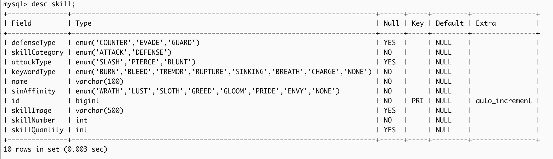 | skill | id (PK), skillNumber, name, skillCategory, sinAffinity | - | 스킬의 기본 정의 (공격/방어, 속성 등) |